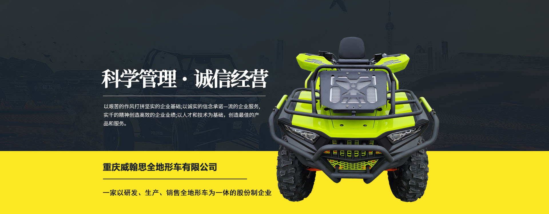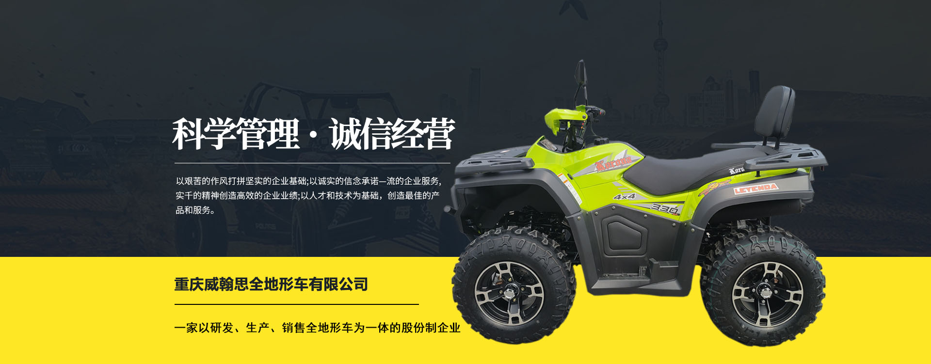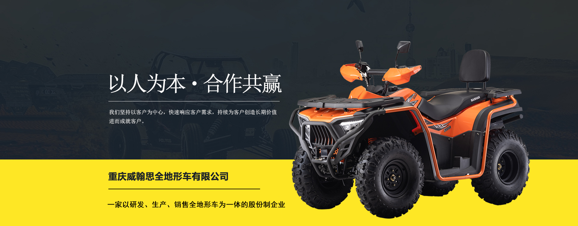 現有專業市場售后服務團隊。公司秉承“敬業、超越、活力、用戶至上”的企業精神,“以人為本,合作共贏;”的核心價值觀,“嚴格管理創優質、名牌戰略拓市場”的質量方針,使公司一步步邁上新的臺階。公司與重慶航天巴山摩托車制造公司達成戰略合作協議。共同出資致力于沙灘車旅游市場產品研發,項自運營指導,市場維護等全方位市場拓展。重慶航天巴山摩托車制造公司授權;重慶威翰思全地形車有限公司為中國區唯─戰略合作伙伴。